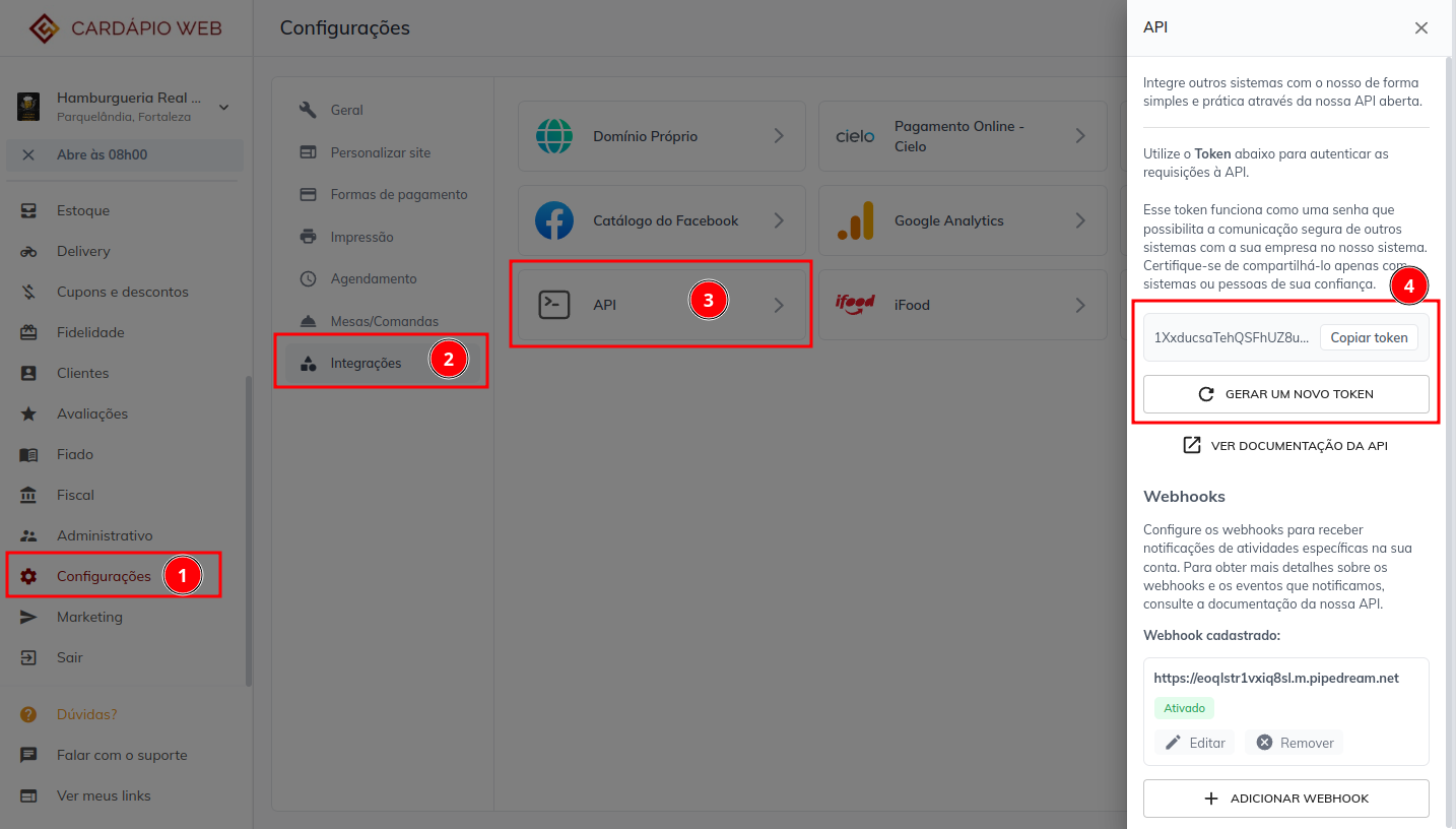 - Adicione o link na seção de Webhook do Cardápio Web.